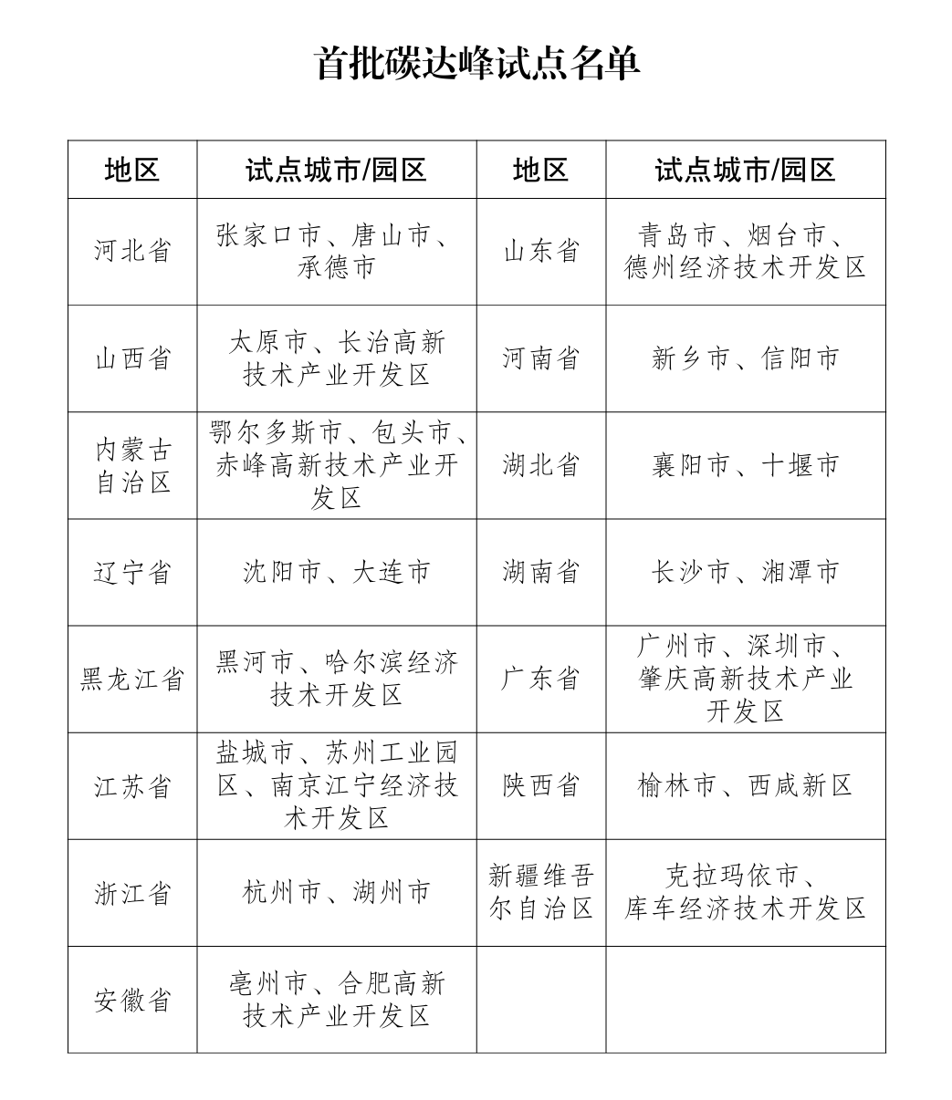 首批碳达峰试点名单发布涉及15个省、25个城市、10个园区